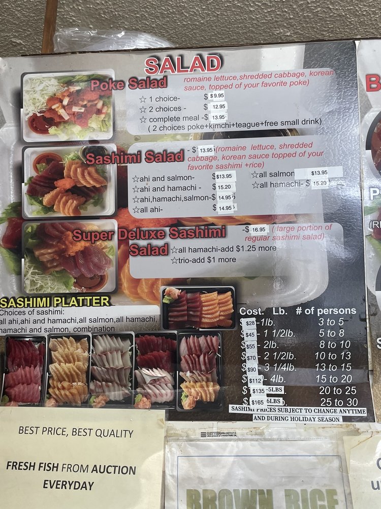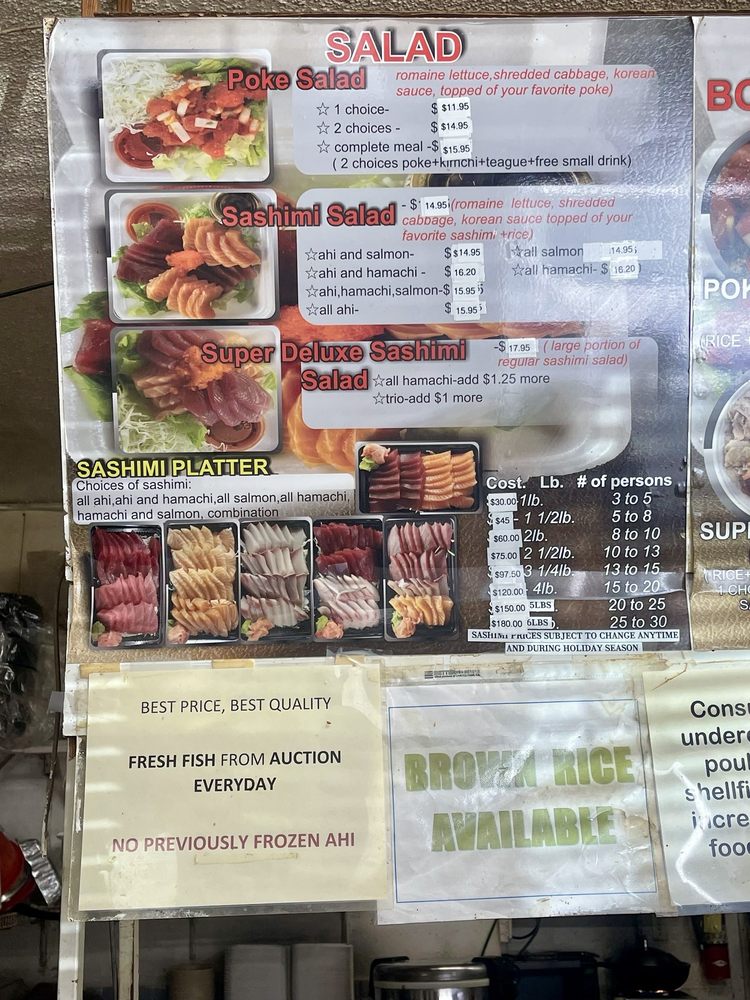 Romaine lettuce, shredded cabbage, Korean sauce, and topped with your favorite poke. 2 choice poke, kimchi, Taegu, and free small drink.