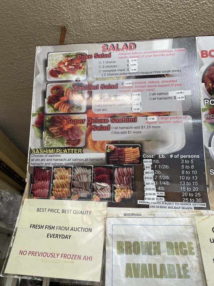 Romaine lettuce, shredded cabbage, Korean sauce topped with ahi & salmon sashimi, and rice. Romaine lettuce, shredded cabbage, Korean sauce topped with ahi & salmon sashimi, and rice.